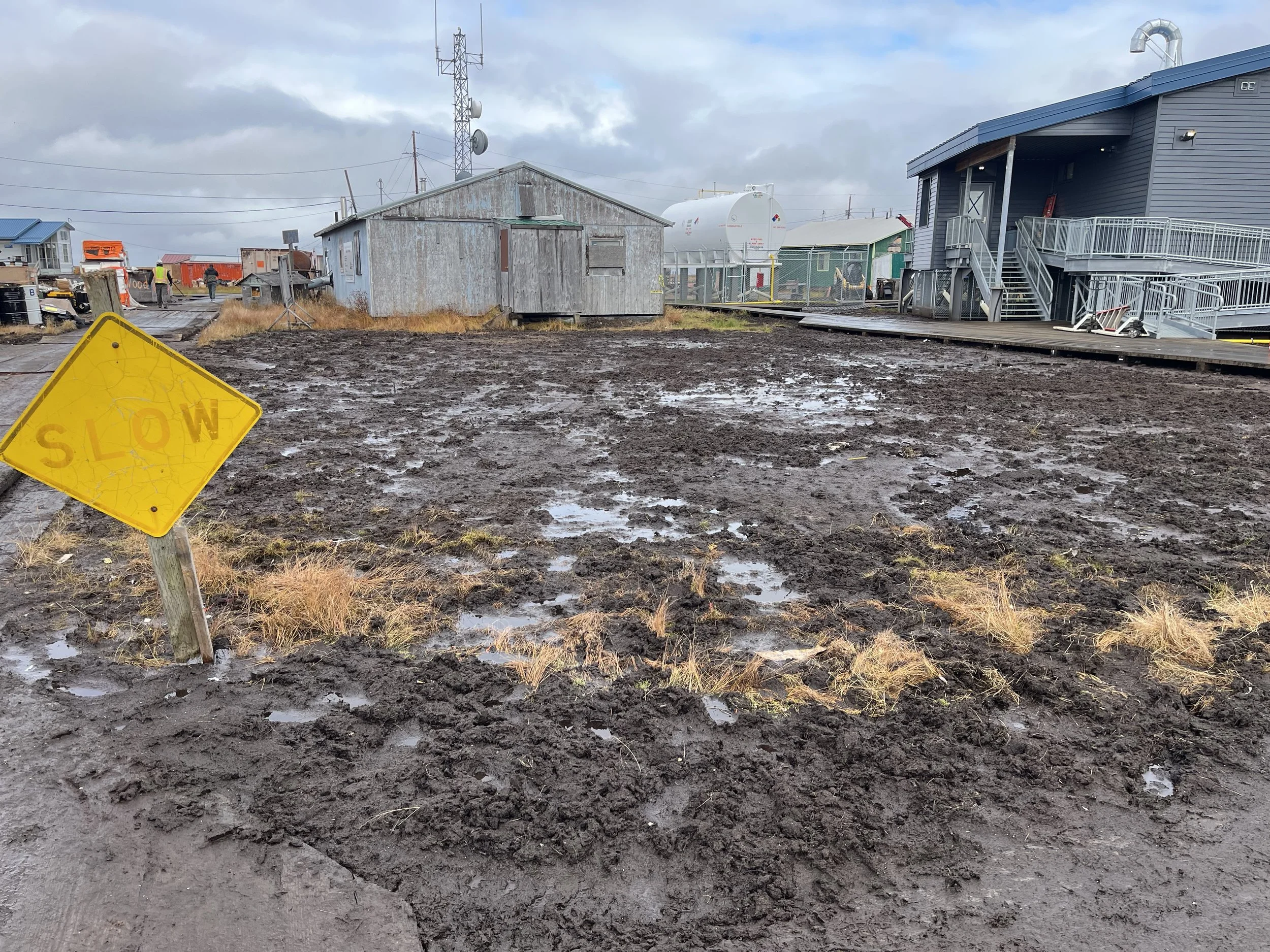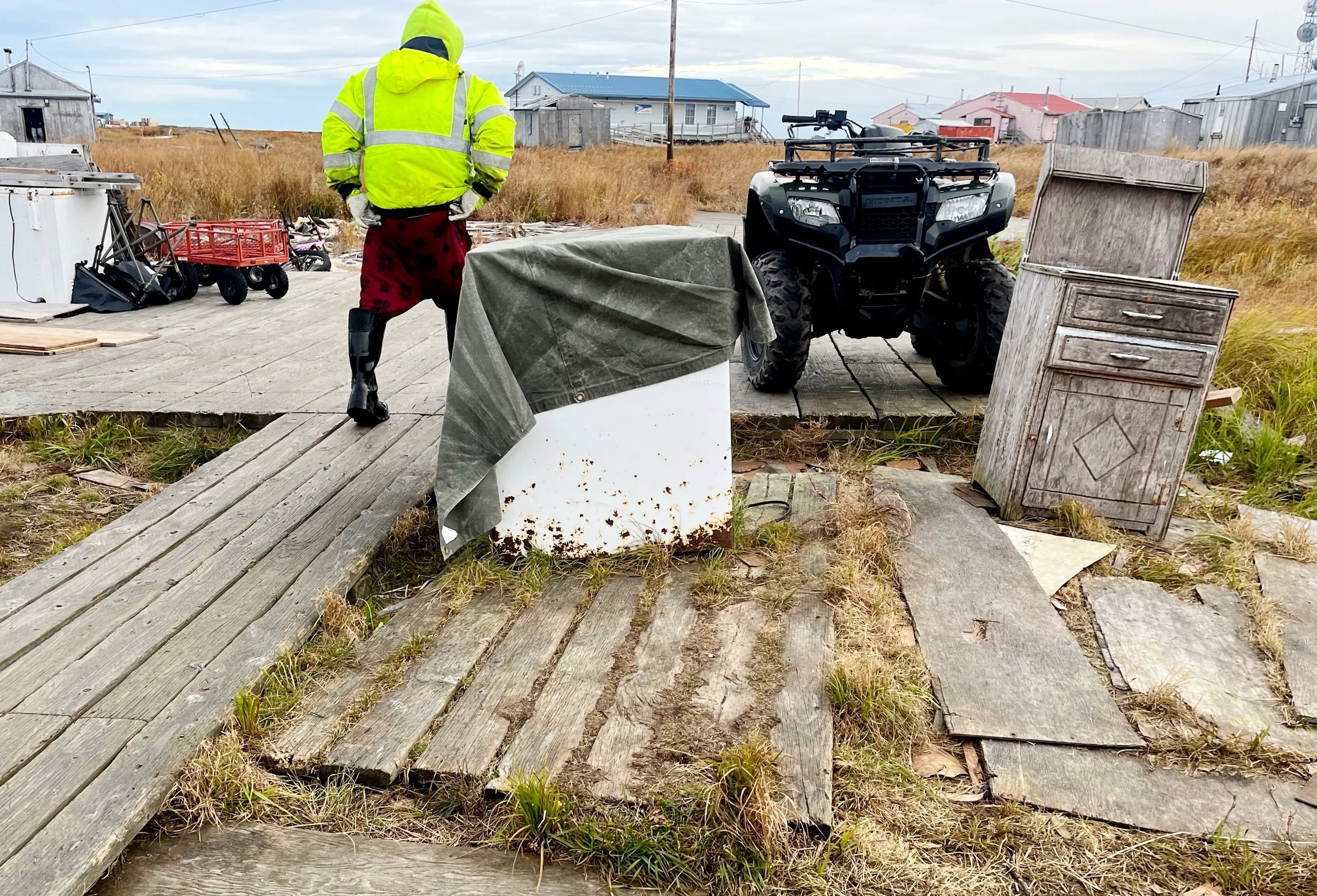 But others have taken deeper falls into the mud. Residents pointed at different routes that they used to take, but don’t anymore. Places where the old, thinner boardwalks got sucked into the soil, and routes through the tundra they wouldn’t brave these days. There’s places on the boardwalk that routinely get flooded or always having sitting water, that people find new routes around or walk through in muck boots.