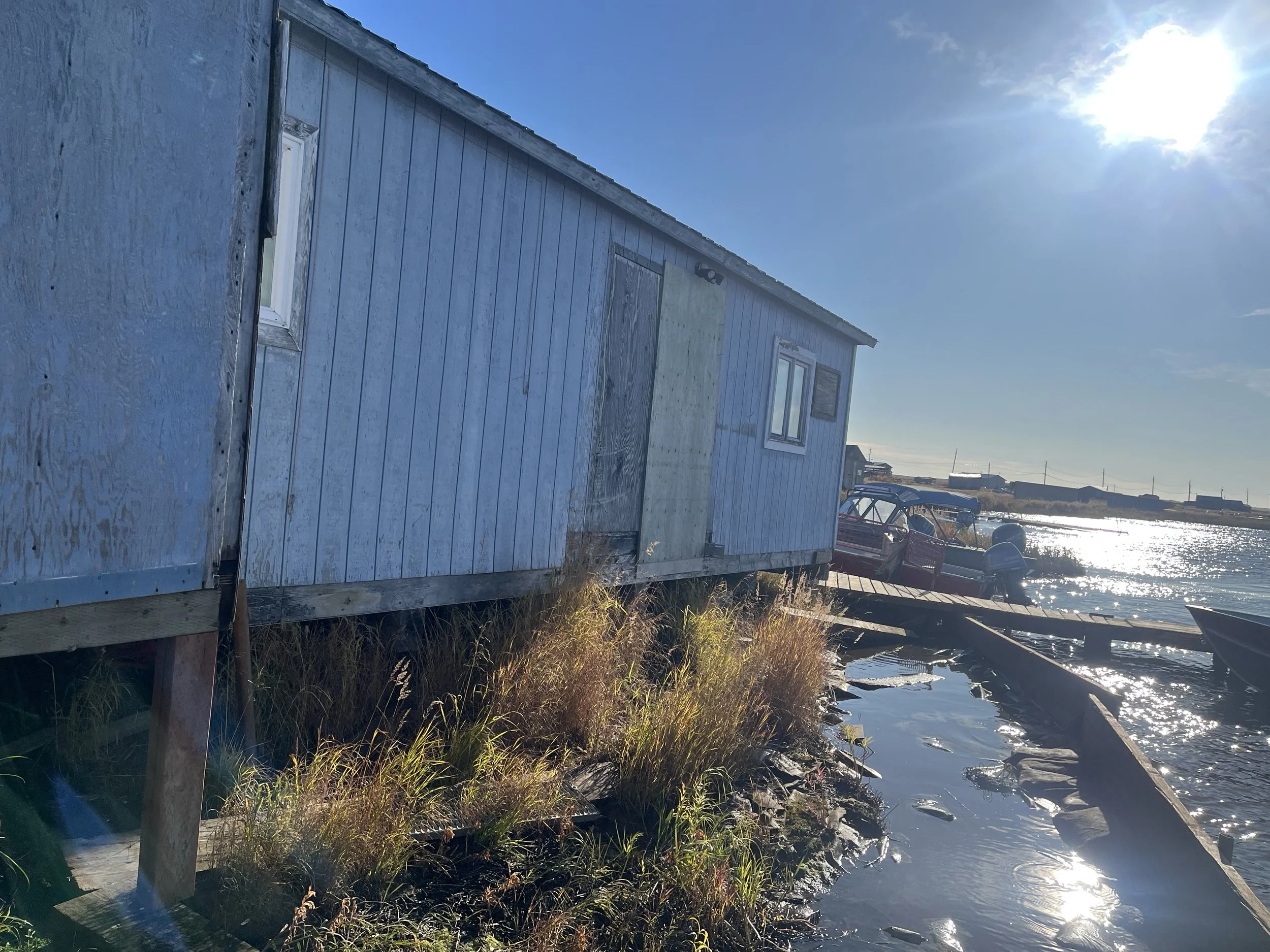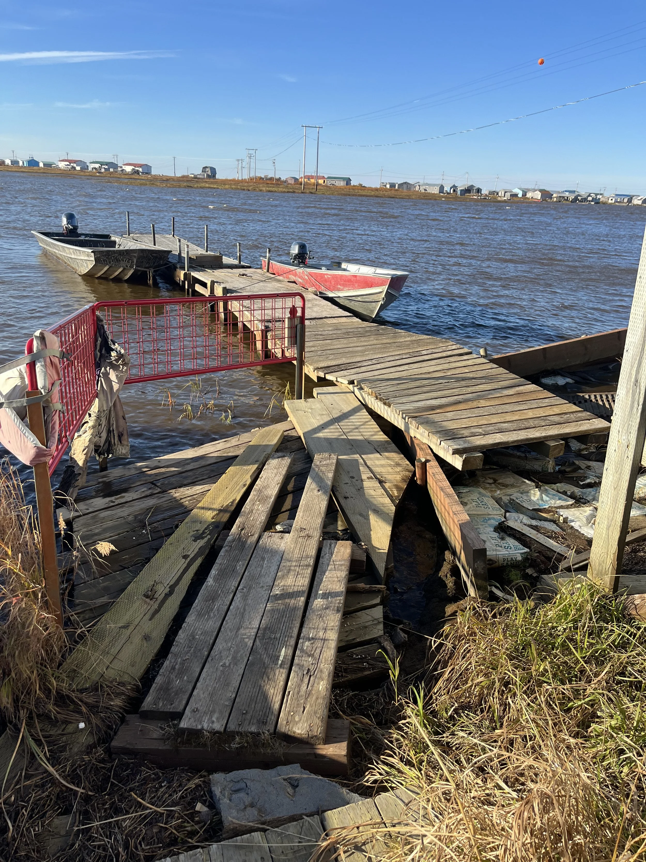 The groups boarded up the entrance they used to use to access their boats because of the erosion. Now they use a side door that leads to a haphazardly constructed dock. It’s janky, narrow, and missing planks. It's pieced together with loose nails and spare boards.